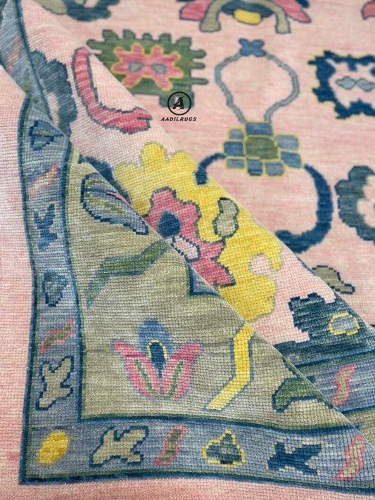 Pink And Blue oushak Rug, Modern, Vintage, Turkish, Eclectic, Floral, Pastel, Washable Area Rugs for Living Room, Dining, Bedroom, Nursery 9x12